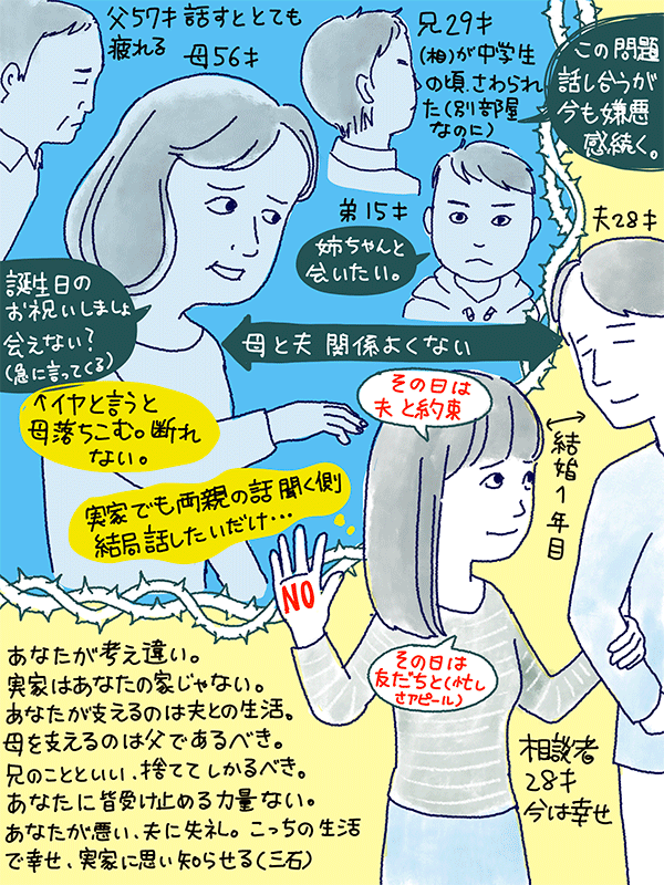 実家の家族との関わり方、誘いの断り方、心の持ちようを伺いたい28歳結婚一年目女性のご相談。