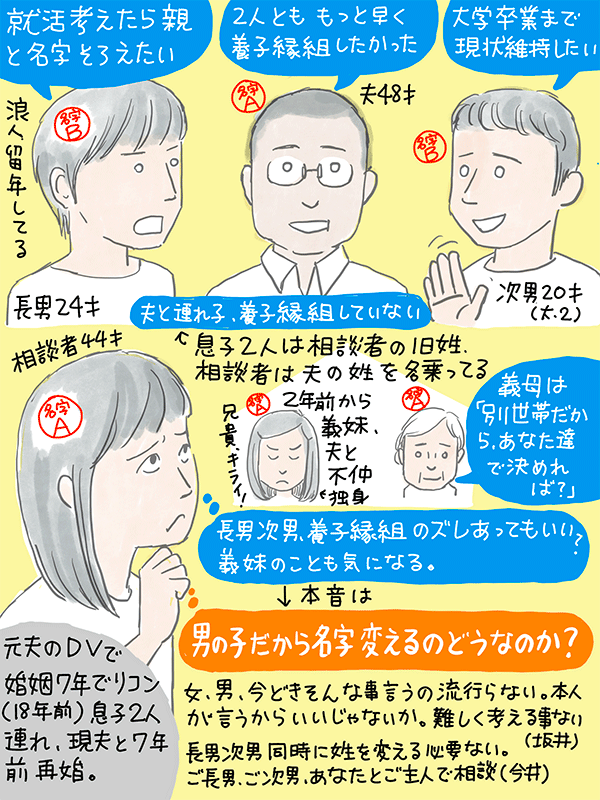 息子二人連れて7年前再婚。息子二人とも夫と養子縁組しておらず別姓のままだが、長男が「就活のために親と名字を揃えたい」と言われ、夫も養子縁組に乗り気。しかし次男は大学卒業まで今の名字を変えたくない。