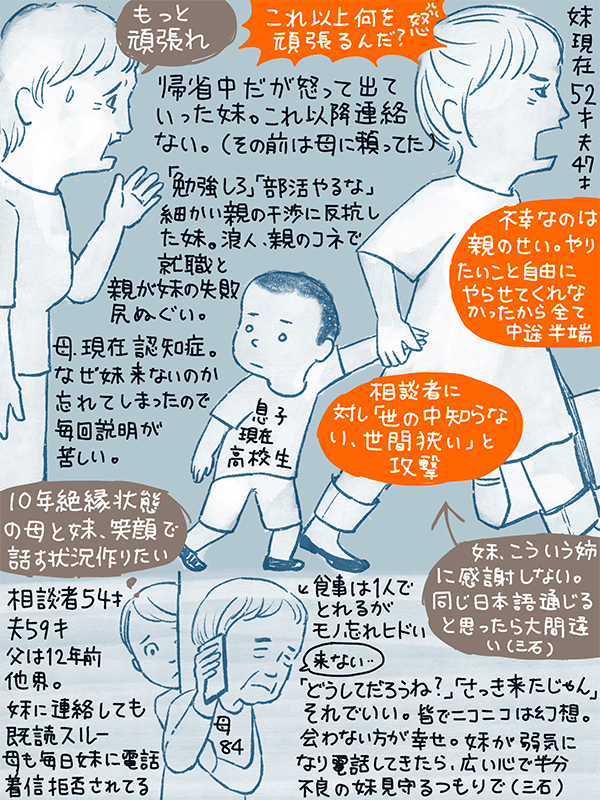 10年前から母の細かい干渉がチリに積もった?「もっと頑張って」の言葉がきっかけで妹から連絡がなくなった。