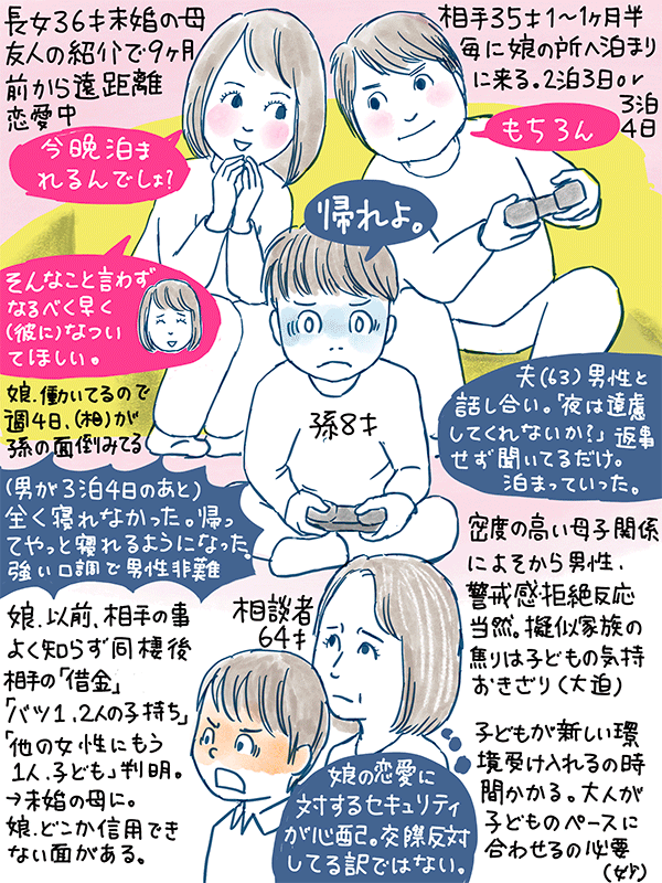 相手の男性が泊まりに来てレジャーに連れ出したりして理解を得られるよう努力してるようだが、孫は嫌がってる様子。(娘は否定)