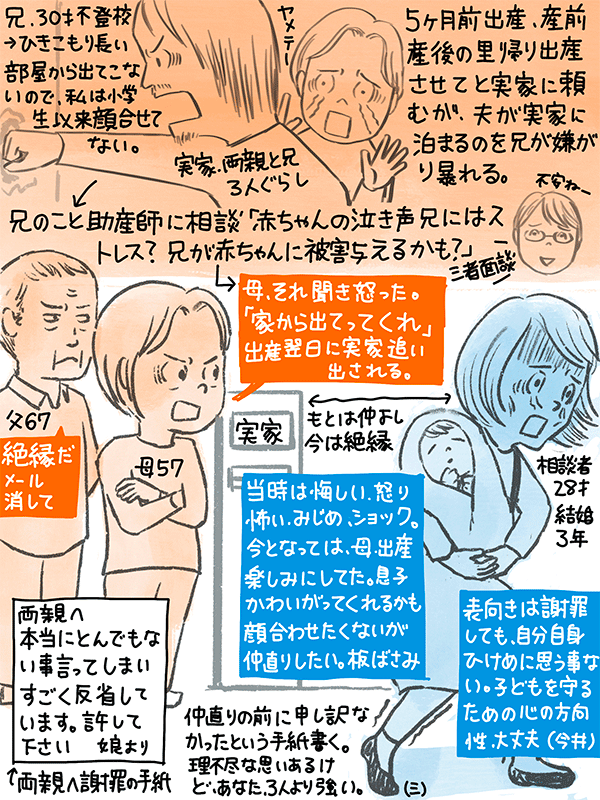 そのことを助産師に相談、母を病院に呼び「兄が赤ちゃんにストレスになり被害与えるかも?」と不安打ち明けると母激怒。出産翌日に実家を追い出され絶縁すると言われた。