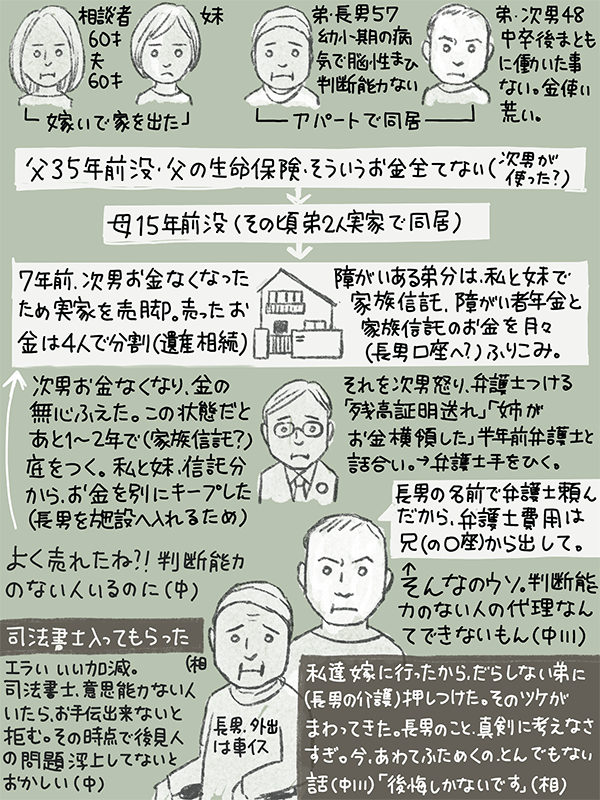 4人兄弟、上の弟(長男58)は脳性麻痺で障がいがあり、下の弟(次男48金遣い荒い)とアパート暮らししている。