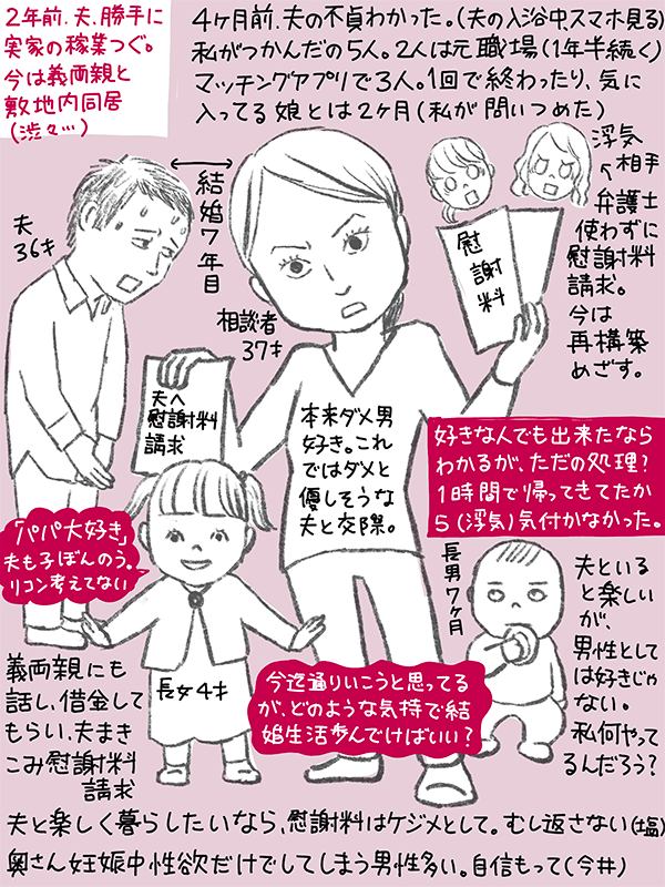 4ヶ月前に夫の不貞発覚、夫を巻き込み3人に慰謝料請求。(弁護士使わず自分で)