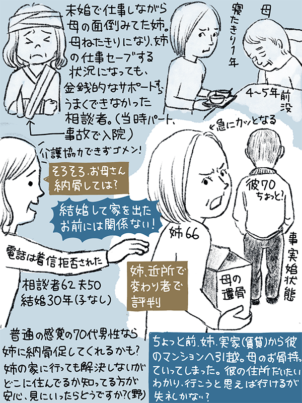 母は亡くなったが、姉は「ずっと母と一緒にいたい、父は浮気してたので一緒の墓に入れたくない、結婚して家を出たお前には関係ない」とお怒り。遺骨を持ったまま彼氏の家へ引越し電話も着信拒否。