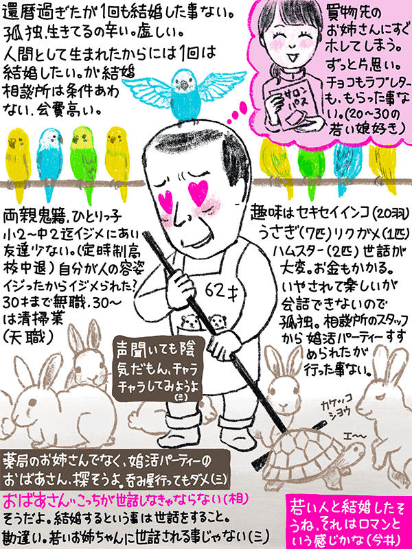 趣味でセキセイインコ、うさぎ、カメ、ハムスターを飼ってるが会話ができないので孤独。
