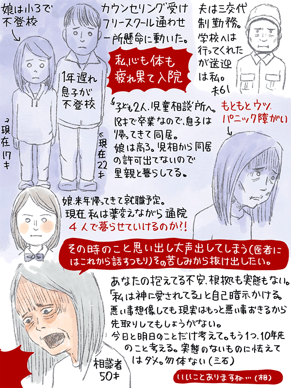 娘が小三、一年遅れて息子が不登校になり、カウンセリング受けたりフリースクールに通わせたりと一所懸命に動いたら体も心も疲れ果て入院、小4娘、中三息子ともに児童相談所へ。