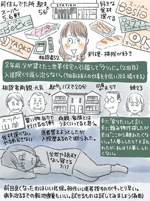 二年前に父が建てた二世帯住宅に引っ越ししてから「うつ病」に。入退院を繰り返して治らない。