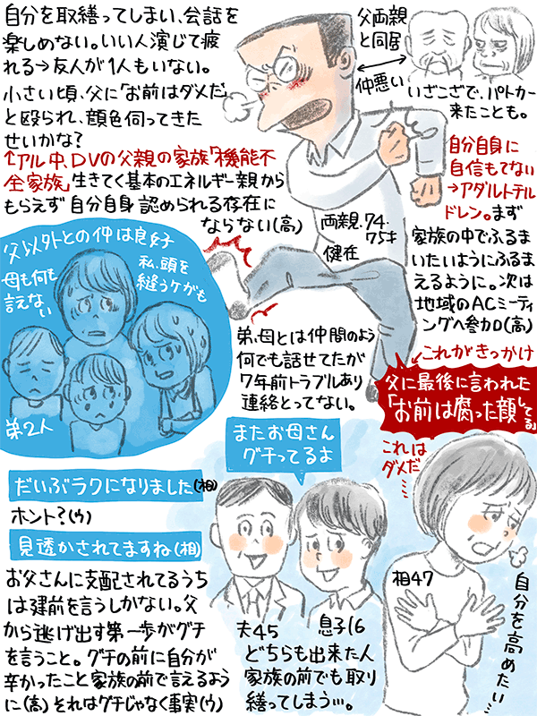 家族の前でも取り繕ってしまうという47歳女性のご相談。
