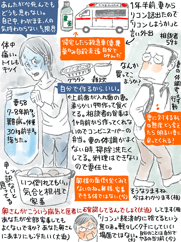 妻の体調が悪い時掃除洗濯をしたり、自分の態度を変えようと努力してるが妻にうまく伝わらない、どうしたらいいか?という59歳男性のご相談。