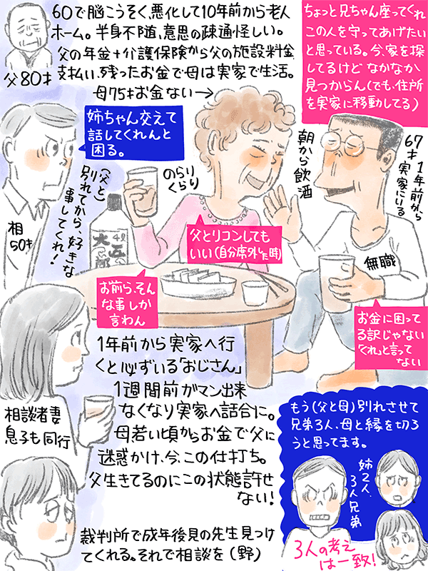 脳梗塞が悪化し、半身不随で意思の疎通がとれず老人ホームにいる父(80歳)がいるのに、実家で「おじさん」と同居している母。「おじさん」はお金は困ってない、お母さんを守ってあげたい、家を探してると言いながら住所を相談者実家に移し、朝から飲酒、働いてない。