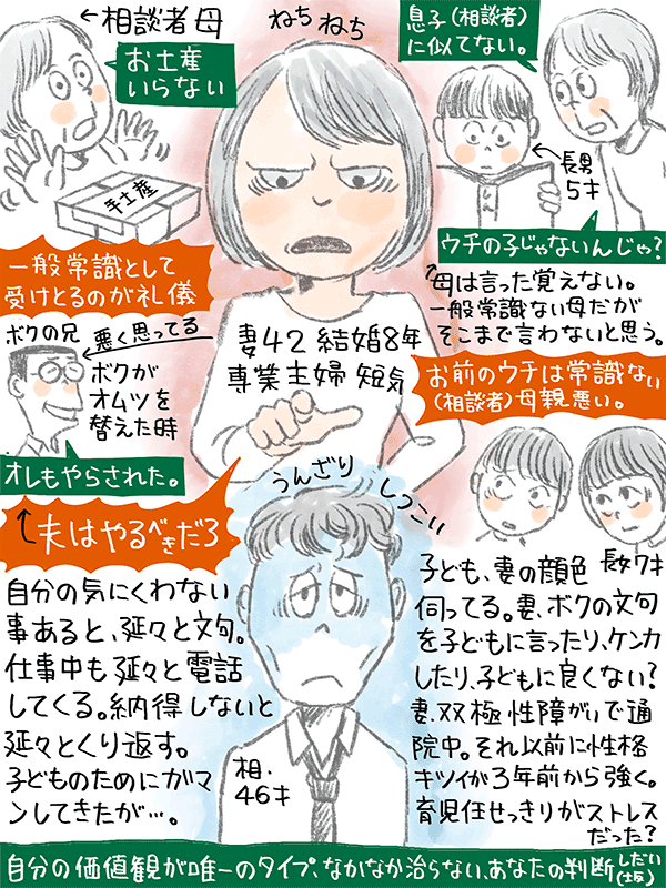 双極性障害で通院中のせいかもしれないが、言葉強くて子どもが泣いたり、母親の顔色伺ったり、それもよくないかな。妻のモラハラ、離婚すべきか?という46歳男性のご相談。