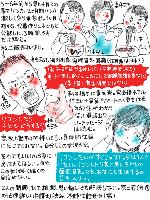 妻は自分と話すのが怖いといい話し合いにならない。離婚したら私との関係が変わるので家に戻り子供の面倒を見るが、今、あなたと生活するのは苦手、無理という。どうすれば妻が戻ってくる可能性高められるか?この状況続くの自信がないという45歳男性のご相談。