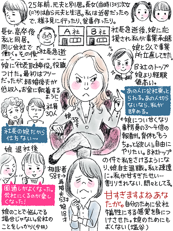娘と一緒に勤めてた会社の経営者が急逝、私が事業を引きつぎ娘と二人で事業所(二箇所)を立て直してきた。娘は代表取締役に。最初のうちは普通だったが結婚後お金に執着するように。従業員との折り合いも悪く、私にあたるように。娘は自主退職、割り切れないがどう割り切ったら?悶々としているという58歳女性のご相談。