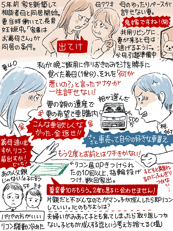 五年前から母と同居、妻の母に対する文句がすごい。妻から「義母を追い出すか離婚」と離婚届を10回以上叩きつけられ離婚考えてるが、片親だと息子達が不憫。息子が成人したら即離婚したいという46歳男性のご相談。