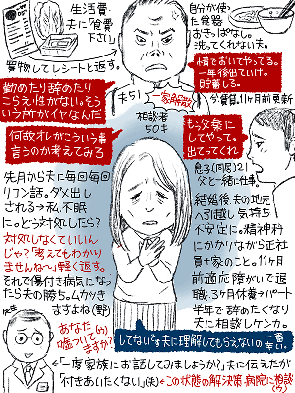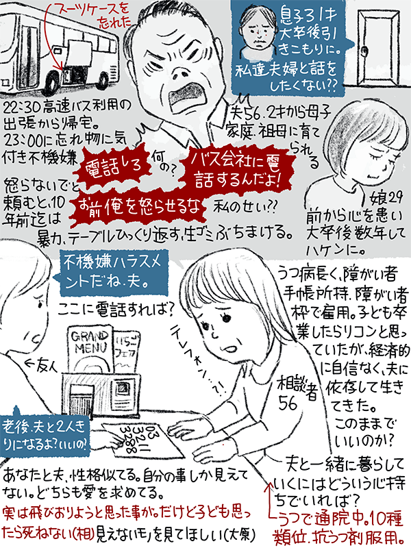 友人に夫の話をすると「不機嫌ハラスメント」「老後二人きりになるの、いいの?」と言われている。子供が卒業したら離婚と思ってたが経済的に自信なく夫に依存して生きてきてしまった。このまま夫と一緒に暮らしていくには、心が壊れないようにするにはどうしたら?という、うつ病で通院中の56歳女性のご相談。