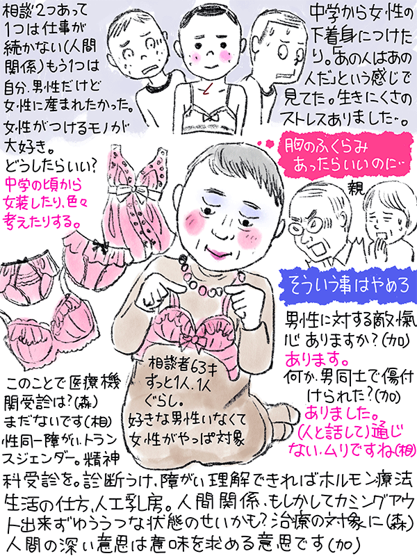 ひとつは自分自体、人間関係で仕事が続かない。もう一つは自分は男なもので女性に生まれてきたかった。女装したり色々考えたりする。女性が(身に)つけるものが大好きだ。どうしたら?という63歳男性のご相談。