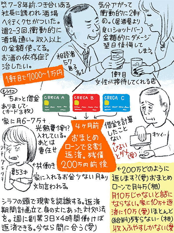 ひとつは、酒場に行く癖が酷く収入よりかなりの金額を酒場に使ってしまい依存症を自覚している。