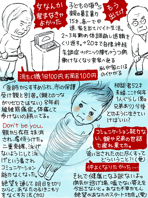 親から出てけと言われて15歳で高校中退して家出、バイト生活のち自律神経失調症、うつ病になり実家へ戻るが嫌がられ、市の保護受けて親と別居。八年前に線維筋痛症になり体が痛いの続いてる。今後どのようにやって生きていくかヒントほしい52歳女性のご相談。