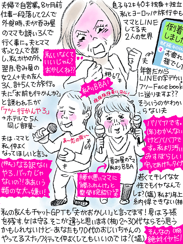 海外旅行中でも呑み屋のママとLINEしてる夫。呑み屋のママの返信も、私への気遣いはなく夫と二人の世界。証拠がないと慰謝料とかなにもできない。できればお金もらって離婚したい。相手の女から慰謝料とりたいという67歳女性のご相談。
