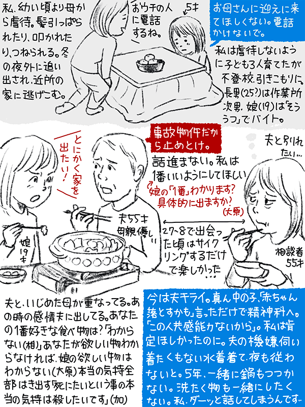 親から虐待されて育った私と、優しい母親に育てられた夫。話が噛み合わない。娘は躁鬱で家を出たがっているが、夫は止め話が進まない。生理的にムリになってきた夫と別れたいという55歳女性のご相談。