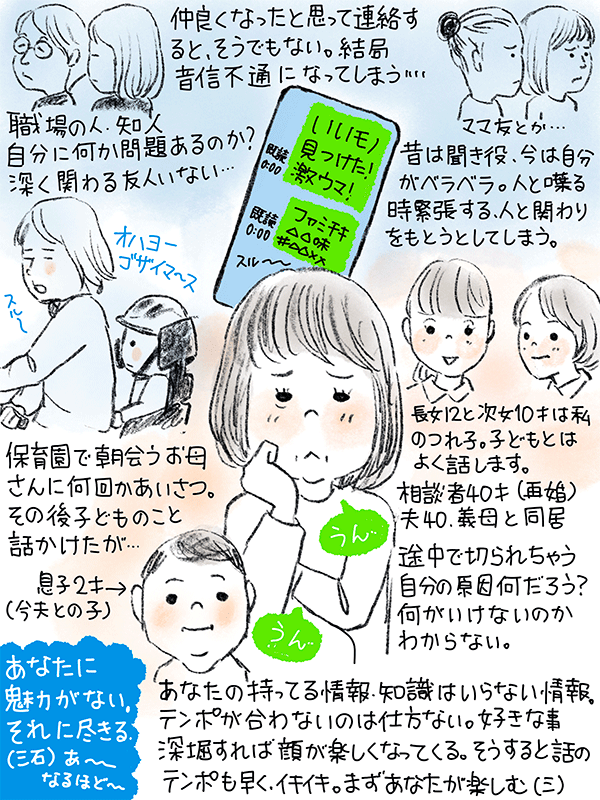 今まで知り合った方々、職場、知人、ママ友…仲良くなったかと思って連絡しても結局音信不通、切られてしまう。深くつきあう友達がいない。自分の何が原因でそうなるのかわからなくてモヤモヤしている40歳女性のご相談。