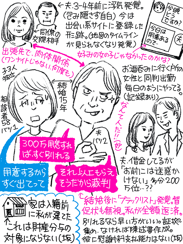 15年前、夫バツ2私バツ1で再婚した。浮気を繰り返す夫、毎日のように同伴出勤し借金もある模様。300万用意すればすぐ出てってやると夫が言うので、用意すると伝えたら「それ以上貰えそうだから裁判にする」。クチが立つ夫、どうしたら離婚できるか?という58歳女性のご相談。