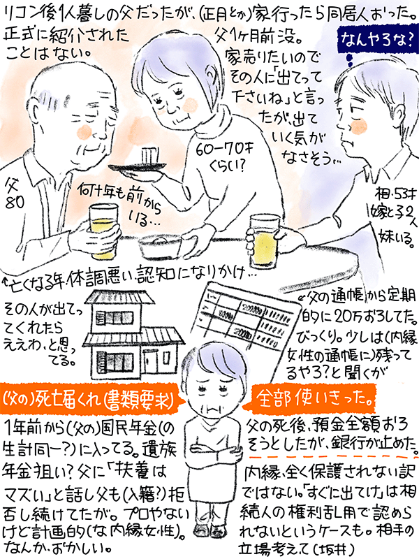 実は自分もコレの進化系(父が知らない女性と亡くなる半年前に入籍&頓珍漢な遺言書)で大変な目にあった笑。母が亡くなった時も、内縁から「母の生前の生活費負担分よこせ」と滅茶苦茶な事言われたな…。坂井先生の仰る通り「時々起こる事態」ですので注意。