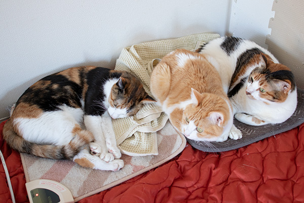 あったか座布団から離れない猫ズ。いつまでこの寒さが続くんだろ〜涙