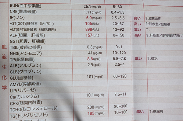 血液検査の結果がかなりショック。肝臓の値がのきなみ悪い。