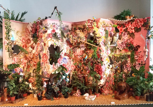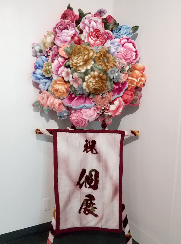 花、薔薇柄の毛布で作成された作品+インスタレーション。インパクト大。