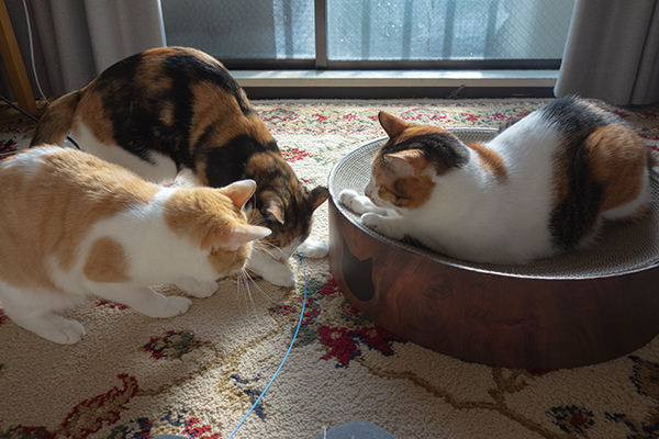 うさぎの尻尾に夢中の3にゃん。