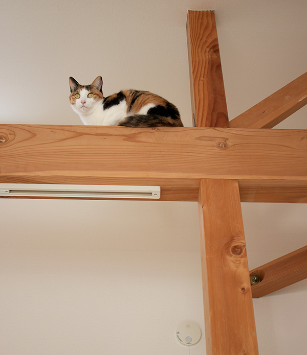 今日は2階の床にワックスかけた。 梁に逃げたコウメ。