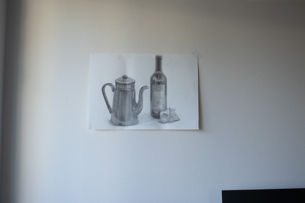絵画教室、2枚目は静物デッサン。ビンが描けて自分でも驚き笑