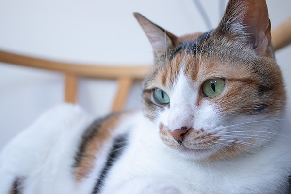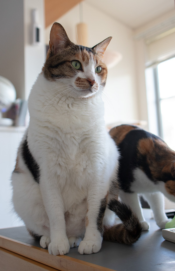 ゴハン待ち中のミケーネたん。痩せたら柱、登れるかな……?