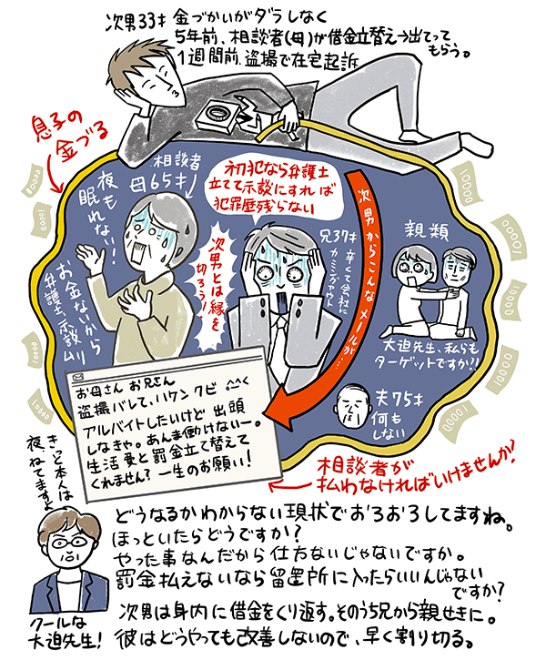 刑事事件(盗撮)を起こし職を失った次男が払う罰金を援助すべきか?という65歳女性からのご相談。