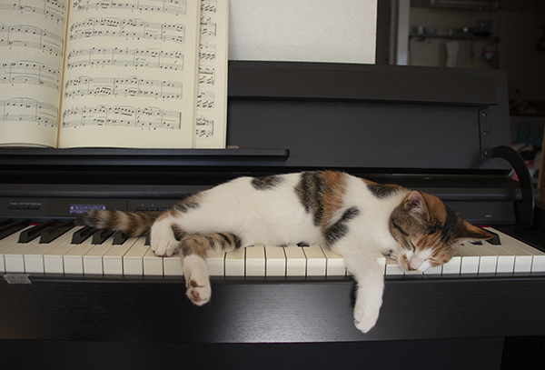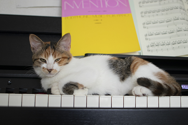ミケーネちゃんがピアノの鍵盤に擬態してた。そこで寝るな。