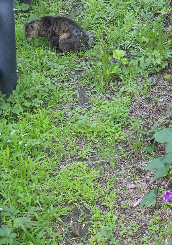 草をはむネコと、見つめるスズメ。