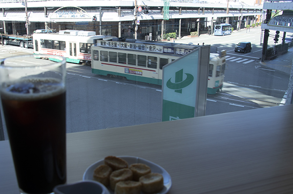 市電見ながら一休み。アイスコーヒーおやつ麩(ラスクみたい)つき。¥562。
