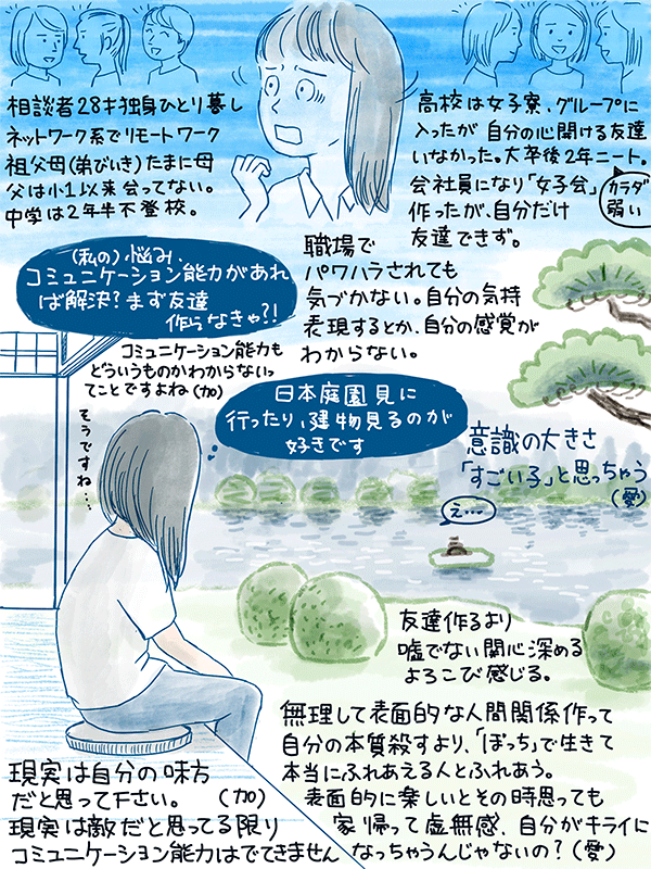 人と関係が長続きしない。(自分の)悩みはコミュニケーション能力があれば解決すると思うのだが、友達作るにはどうしたらいいかわからないという28才女性のご相談。