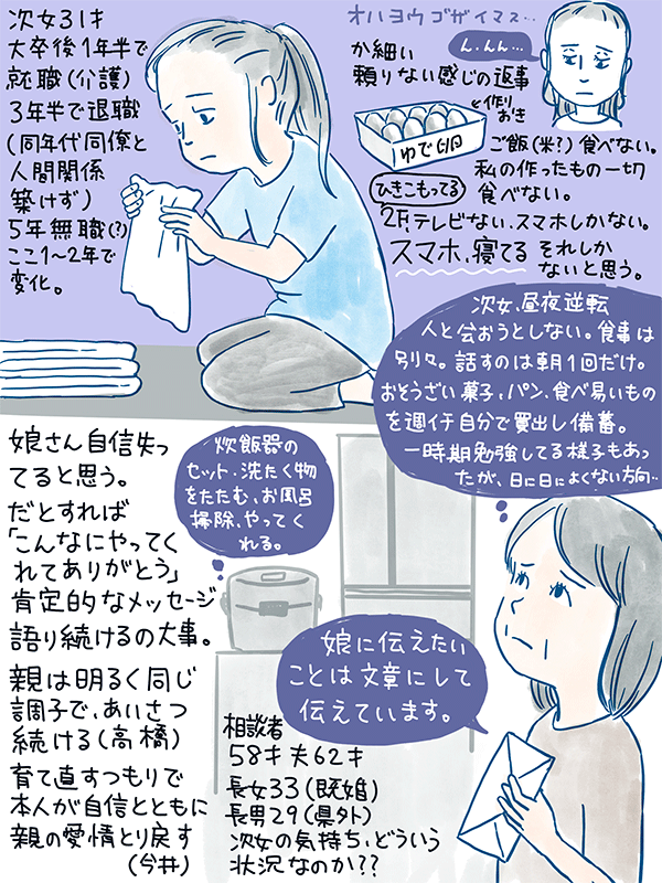 5年前に退職し、引きこもり状態昼夜逆転な31才の次女。家族との会話もほぼなく、「スマホ、寝てる」状態。