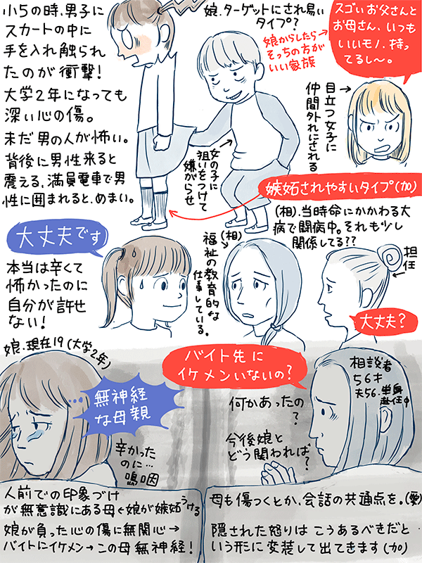一緒に就寝した時、「バイト先にイケメンいないの?」と聞いたら相談者に背中を向けた娘。小五の時、男子にお尻を触られたりしたのが深い傷になってる、先生に本当は辛かったのだが「大丈夫です」と言ってしまった自分が許せないと嗚咽。