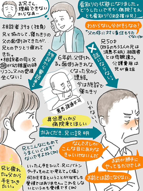 6年前から父が寝たきり。兄と協力して面倒見てきたが、兄と関係よくなく話にならない。