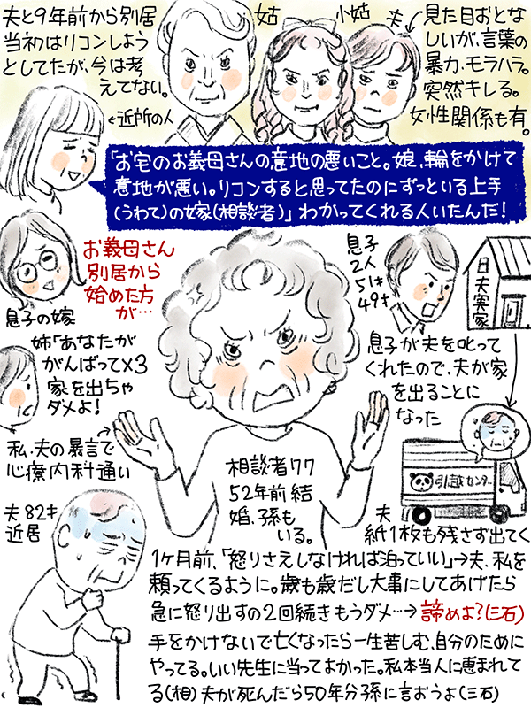 夫と9年前から別居。姑小姑は意地が悪く、夫はモラハラ言葉の暴力、長い間の女性関係もバレて離婚考えたが、弁護士に聞いたり、息子の嫁から「別居から始めた方がいい」と言われ今に至る。1ヶ月前、夫に「怒らなければ泊まりに来ていい」と伝えると私を頼るように。だが優しくしてたのに2回続いて急に怒り出した。もう夫の顔を見るだけで嫌という77歳女性のご相談。