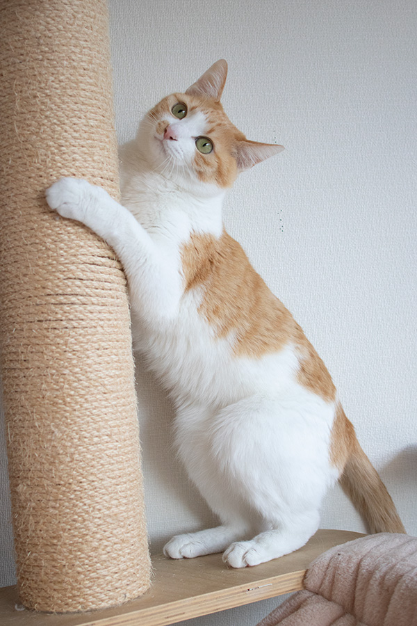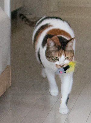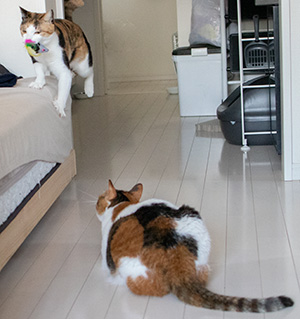 おもちゃのネズミをレトリーブ(持ってくる)するうちの三毛猫2匹。