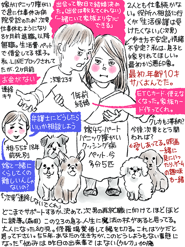 1年前に23歳次男が45歳の女性とスピード婚。嫁がパニック障がいとクッシング病のため?次男は会社を休みがちになり8ヶ月前から無職。生活費やペットで借金をしている模様。