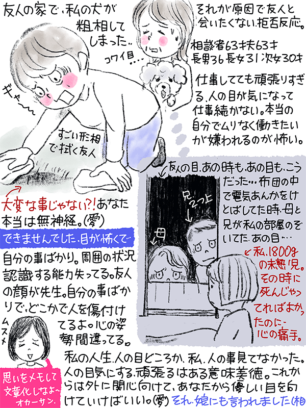 小さい頃から人の目が気になる。友人宅で私の犬が粗相してしまったのをすごい形相で拭く友人を見たのがきっかけで、兄と母が私を見る目もこうだったと思い出した。他人の目を気にしないでいい自分になりたいという63歳女性のご相談。