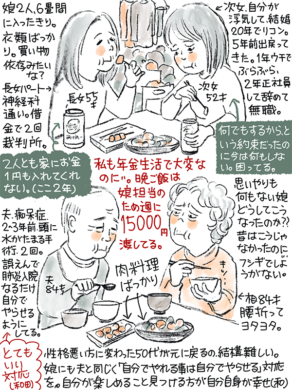 晩御飯は娘担当なので、週に15000円でやりくりしてもらっているが肉料理ばかり。娘達は1円も出さない。思いやりも優しさもない娘、どうしてこんなになってしまったのかな?という84歳女性のご相談。
