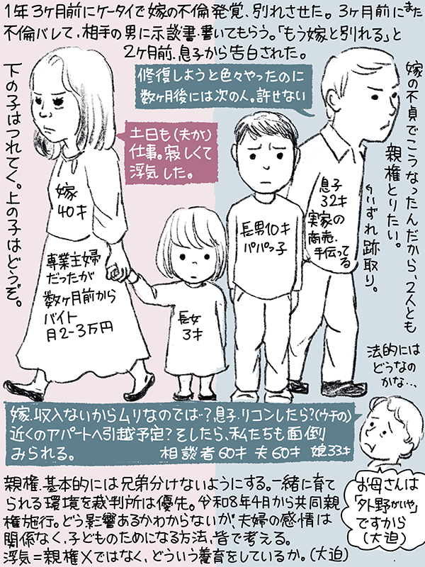 嫁の不貞でこうなったのだから、息子としては長男長女二人の親権を取りたい。嫁には収入もないし…法的にはどうなのかな?という60歳女性のご相談。