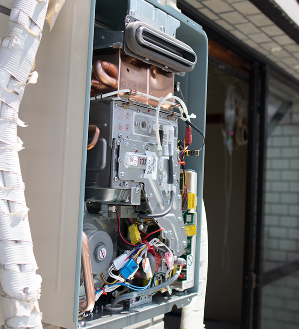 今住んでる賃貸の改修工事、煤だらけだった給湯器(ガス漏れしてた)を交換しに来た。