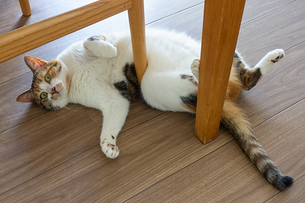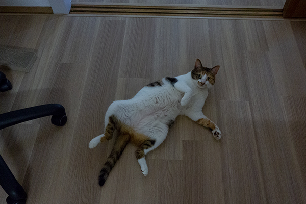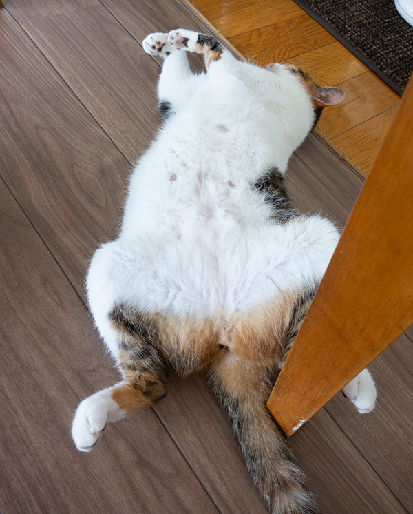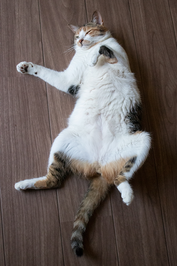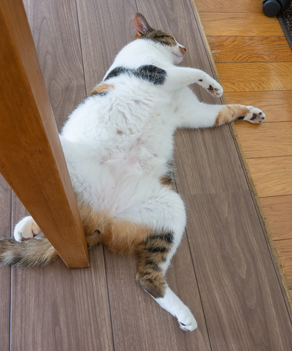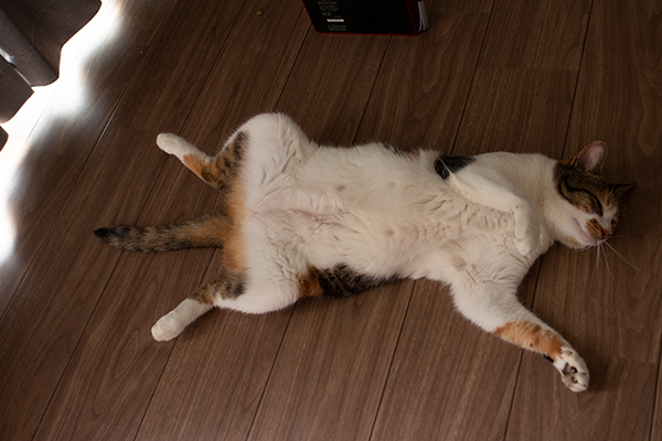 梅雨の晴れ間、ちょっと暑い。ヘソ天で寝るミケーネたん。